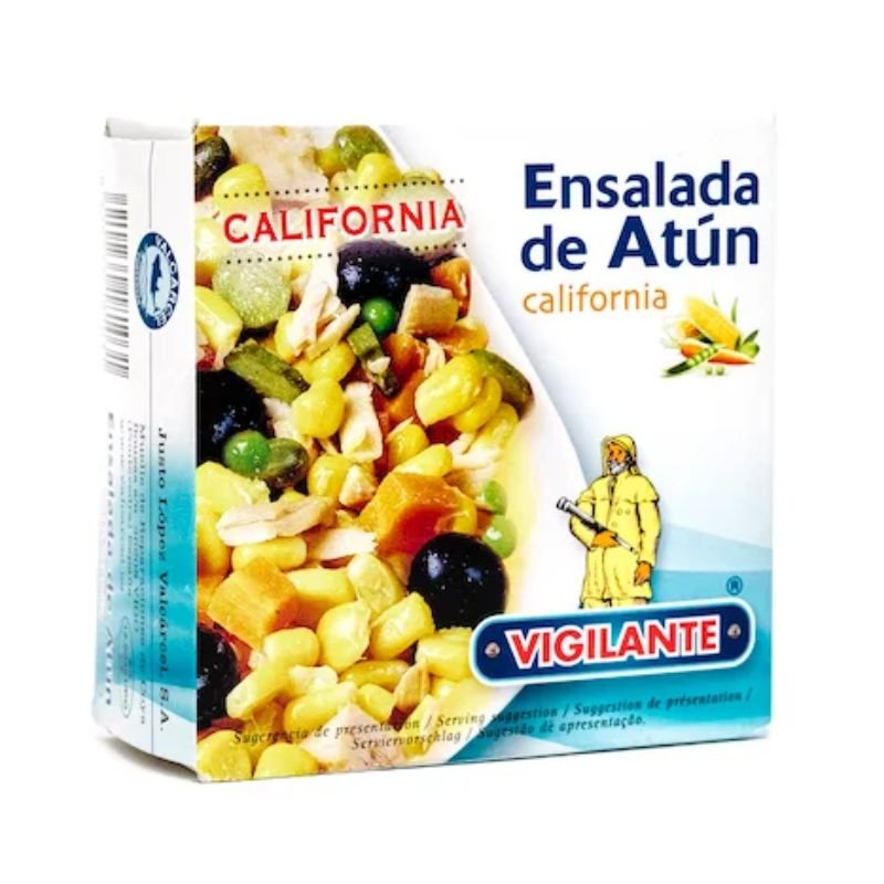 Colorida y apetecible, la ensalada California destaca por su mezcla de maíz, zanahoria, guisantes, pepinillo y aceitunas, combinados con lomos de atún jugoso y un aliño sutil. Su perfil nutricional la convierte en una opción ideal para quienes buscan una comida completa, sabrosa y rica en proteínas.